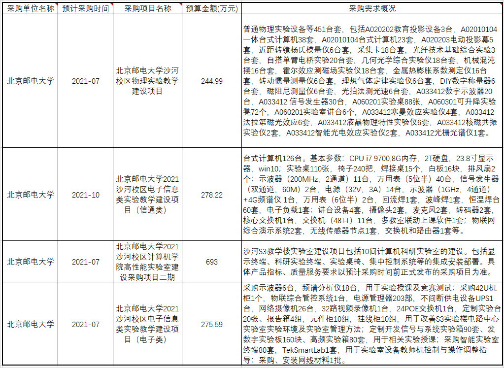 为便于供应商及时了解政府采购信息,根据《财政部关于开展政府采购意向公开工作的通知》(财库〔2020〕10号)等有关规定,现将北京邮电大学2021年7至10月政府采购意向公开如下: