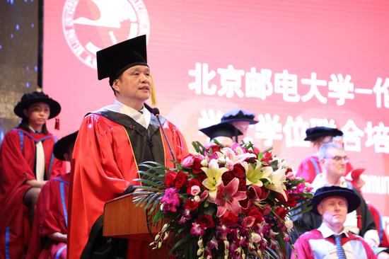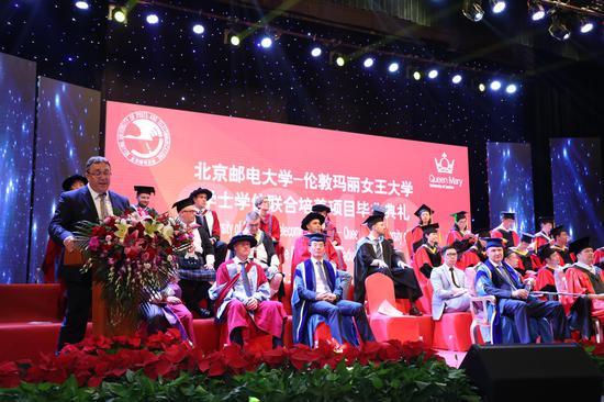 毕业典礼于下午2点准时开始,北京邮电大学校长乔建永教授、伦敦玛丽女王大学Colin Bailey校长、英国大使馆文化教育处教育合作发展主任Donald Hu先生、英国工程技术学会国际运营总监Ian Mercer先生到会并致辞,北京邮电大学副校长徐坤教授、伦敦玛丽女王大学Wen Wang副校长也出席了会议,毕业典礼由国际学院院长、联合培养项目中方主任陈岩教授主持。与此同时,联合培养项目教职工代表以及毕业生家长等1000余人也齐聚北邮科学会堂,共同见证2019届毕业生的重要人生时刻。