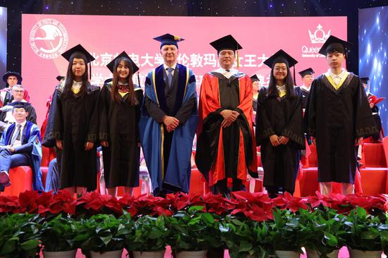 在学位授予环节中,国际学院党委副书记刘睿宣读了2019届毕业生名单及荣誉称号获得者名单。在全场与会嘉宾的见证下,589名毕业生依次上台,接受学位授予,并与乔建永校长、Colin Bailey校长、陈岩院长及联合培养项目英方主任Michael Chai教授合影留念。